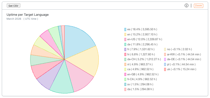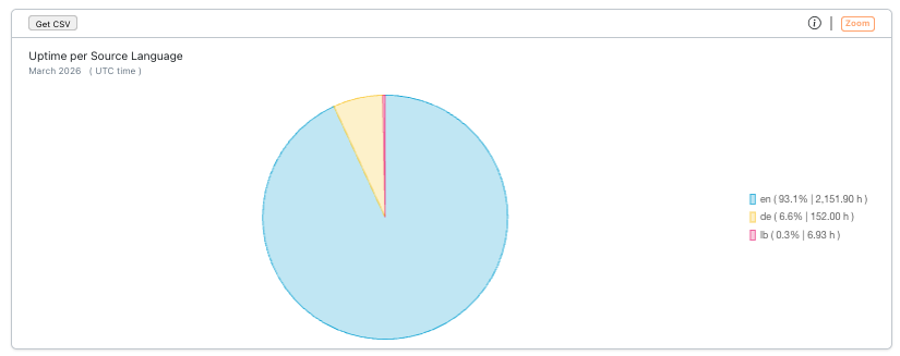A pie chart showing the distribution of transcription session uptime by target language — the language into which captions are translated and displayed to viewers (e.g., en, de, fr). Because a single stream can output captions in multiple target languages simultaneously, each language is tracked independently. Sorted by uptime descending.