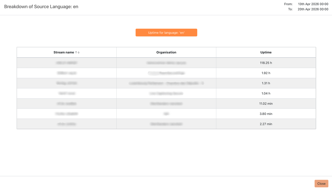 The Live Captions page provides usage analytics for the Live Captions service. It gives you an overview of transcription session uptime, language distribution, and per-stream usage.