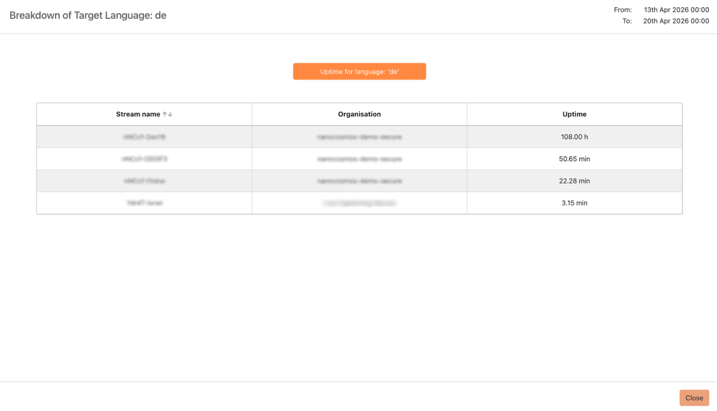 Click any slice to drill down into a per-stream uptime breakdown for that language.