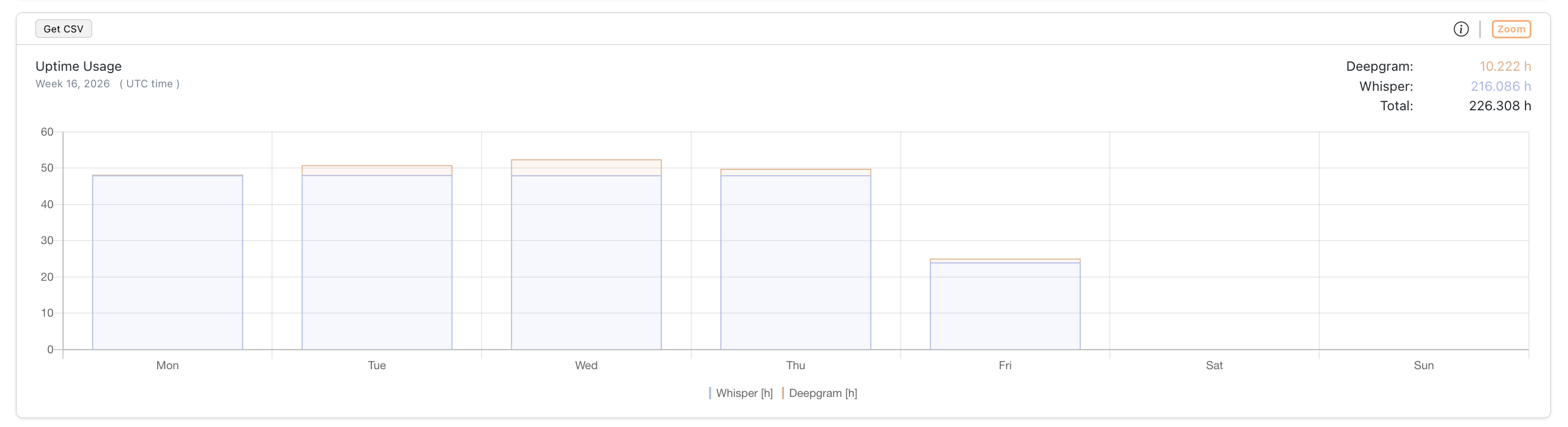 A stacked bar chart showing total transcription session uptime over the selected time range, broken down by ASR (Automatic Speech Recognition) service — Whisper and Deepgram. Each bar represents one time period; each colored segment corresponds to one service. The top-right corner of the widget shows individual totals for Whisper and Deepgram, as well as the combined total across both services.