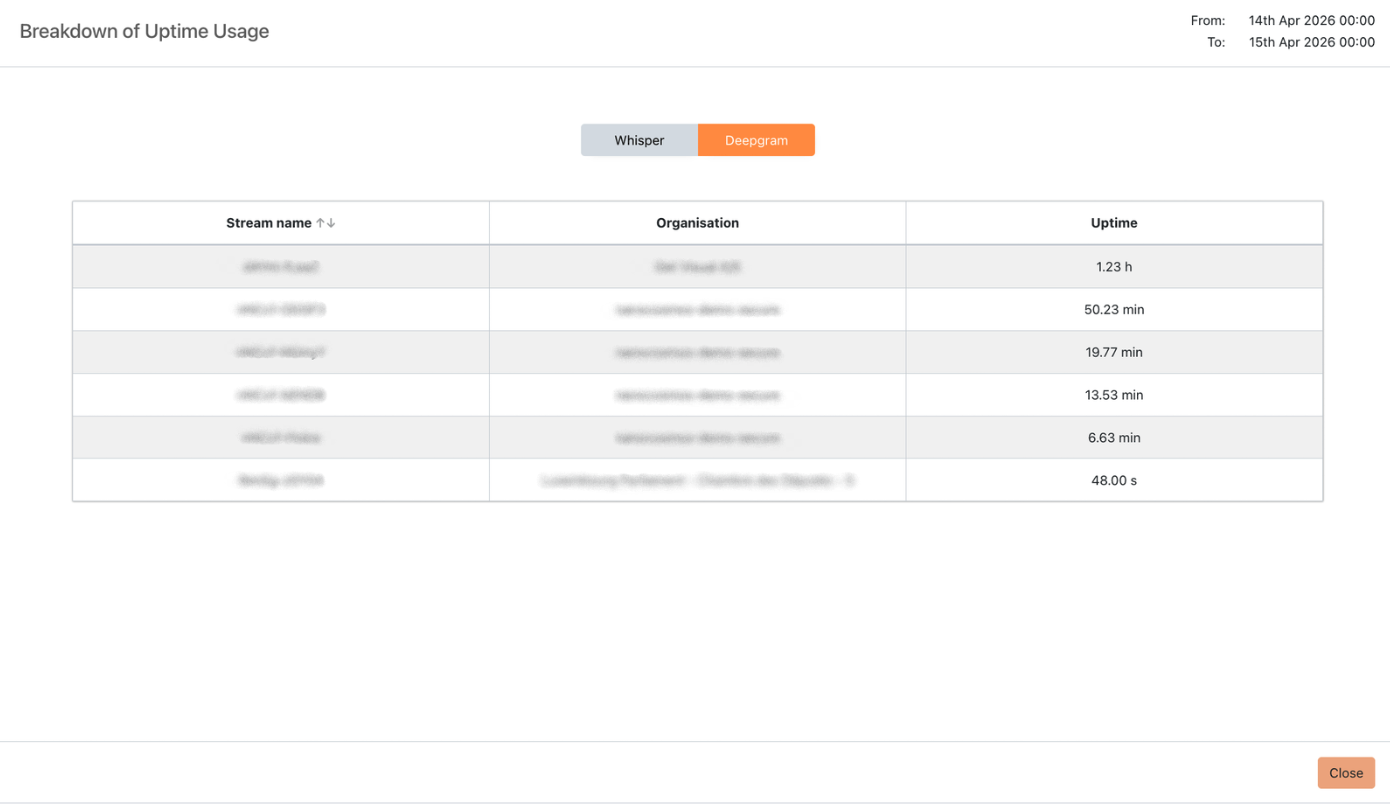 Uptime is measured from the start to the end of a transcription session. Sessions that are still active are not reflected until they end.